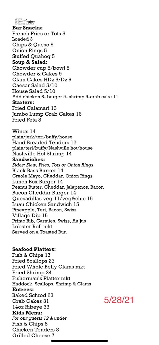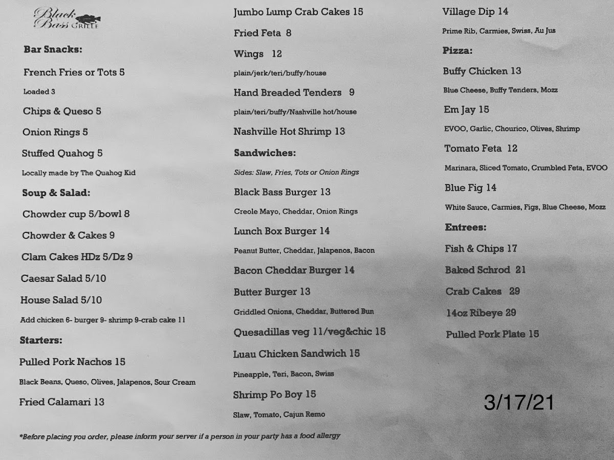 From a reviewer’s perspective, the menu at Black Bass Grille feels thoughtfully curated, striking a balance between classic comfort food and seafood-forward specialties that reflect its coastal setting. The experience often begins with casual yet satisfying Bar Snacks such as French Fries, Loaded, Chips & Queso, Onion Rings, and the local favorite Stuffed Quahog, which set a relaxed, welcoming tone. Moving into Soup & Salad, staples like Chowder, Chowder & Cakes, Clam Cakes, Caesar Salad, and House Salad highlight New England tradition while offering lighter options. The Starters category stands out with crowd-pleasers such as Fried Calamari, Jumbo Lump Crab Cakes, and Fried Feta, all ideal for sharing. For heartier appetites, the Sandwiches selection-featuring Black Bass Burger, Lunch Box Burger, Bacon Cheddar Burger, Quesadillas, and the tropical-leaning Luau Chicken Sandwich-adds variety and approachability. Seafood lovers will appreciate the generous Seafood Platters like Fish & Chips, Fried Scallops, Fried Whole Belly Clams, Fried Shrimp, and the indulgent Fisherman’s Platter, while Entrees such as Baked Schrod, Crab Cakes, and the 14oz Ribeye cater to more refined dining moments. The menu also remains family-friendly with a Kids Menu including Fish & Chips, Chicken Tenders, and Grilled Cheese, alongside comforting Pizza options like Buffy Chicken, Em Jay, Tomato Feta, and Blue Fig. Finally, additional offerings such as Hand Breaded Tenders and Nashville Hot Shrimp round out a menu that feels both inclusive and well-rounded-making Black Bass Grille a dependable choice for a satisfying coastal meal.